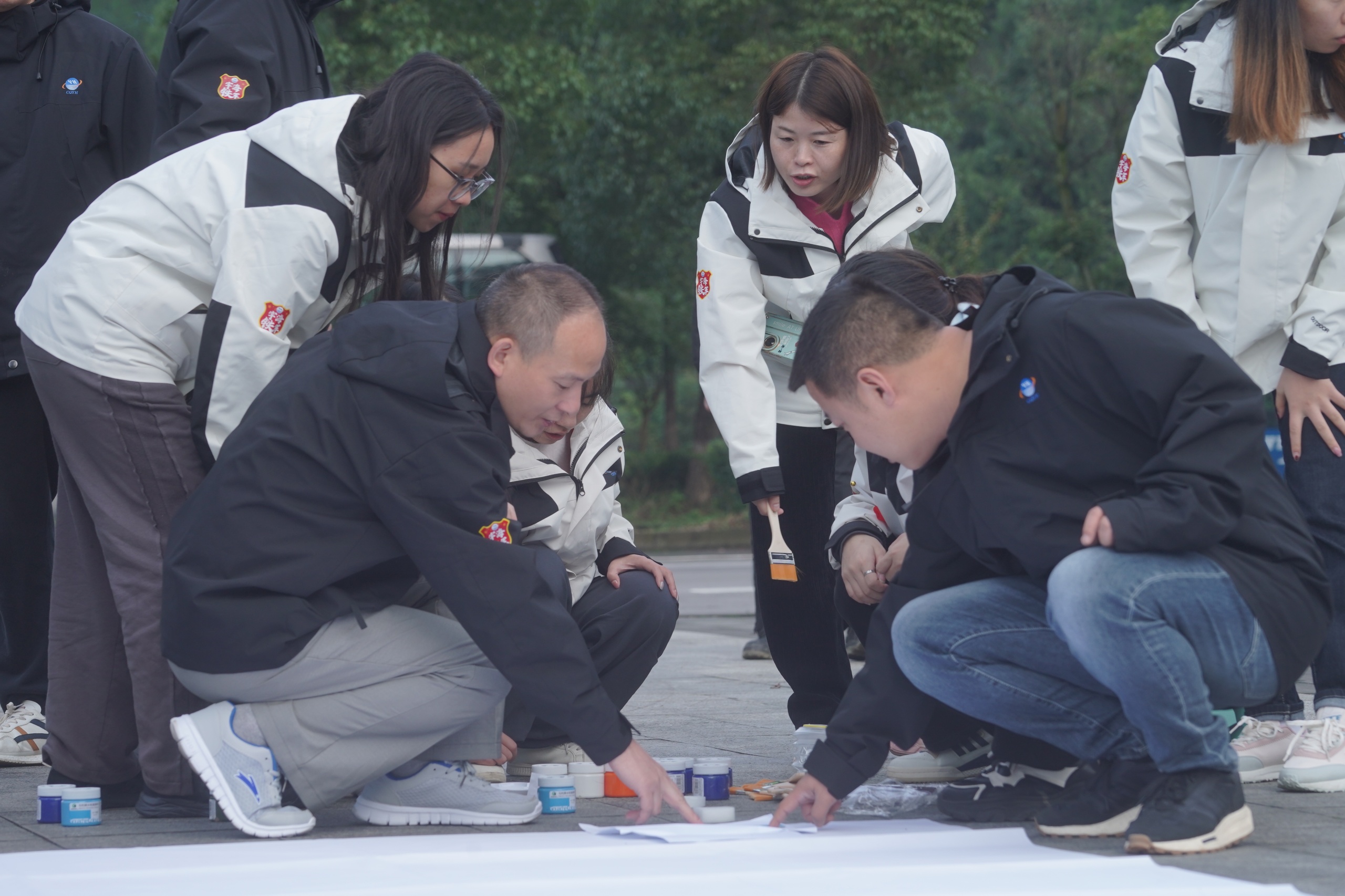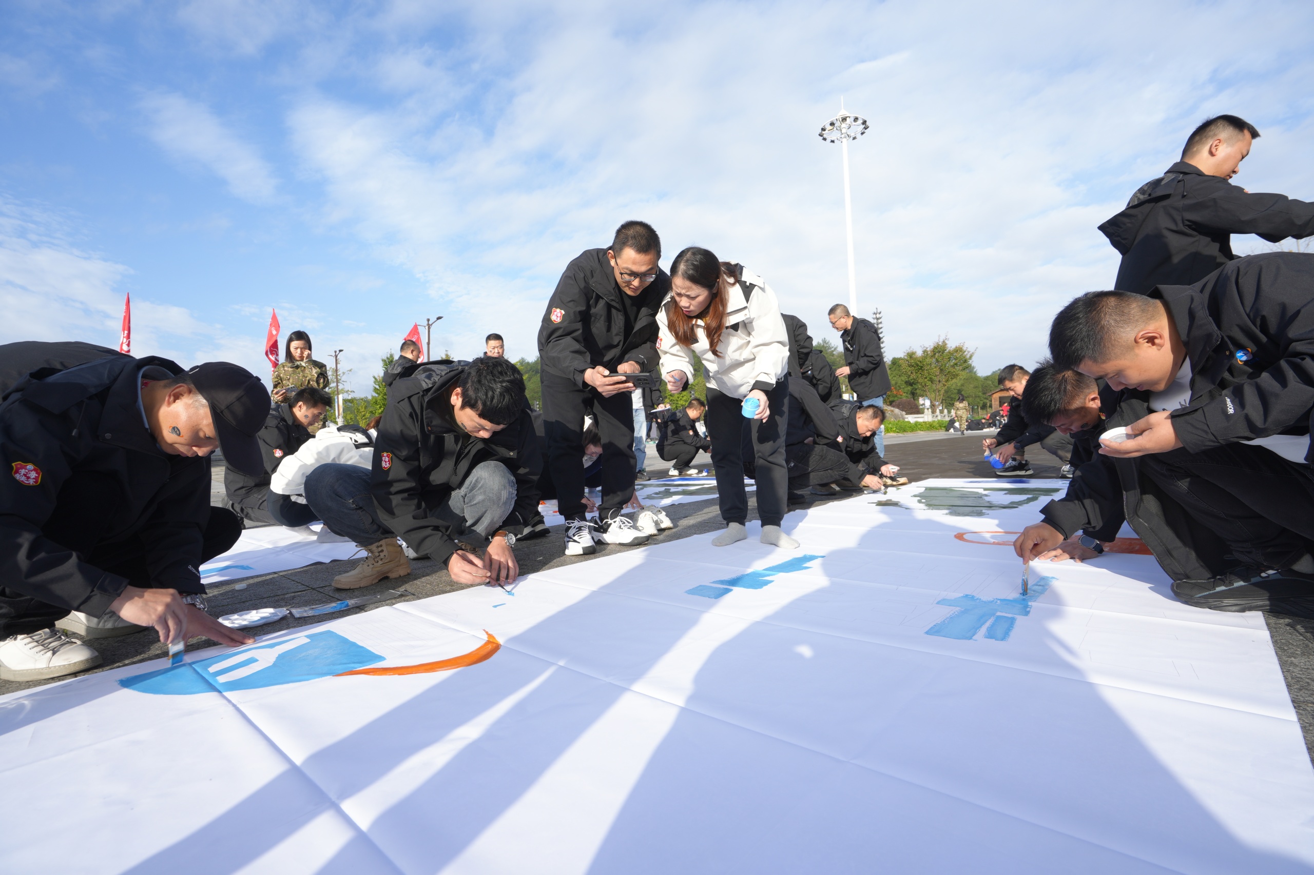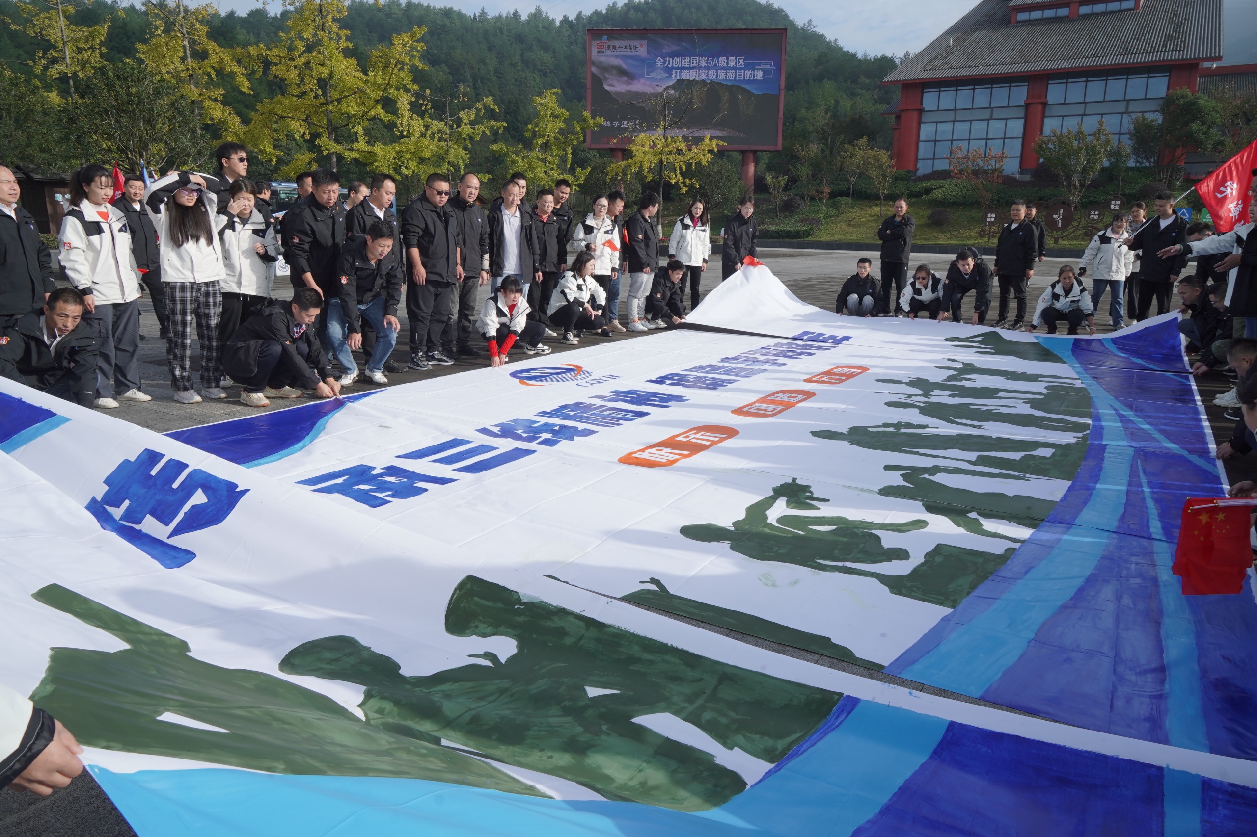 28日早上,武陵山大裂谷广场,共绘蓝图。大家手持画笔,热情洋溢地参与到"宇海精神图卷"的绘制中。每个人都充分发挥自己的专长,有的负责勾勒线条,有的负责上色,有的负责描绘细节。大家齐心协力,共同描绘出公司未来的美好画卷。